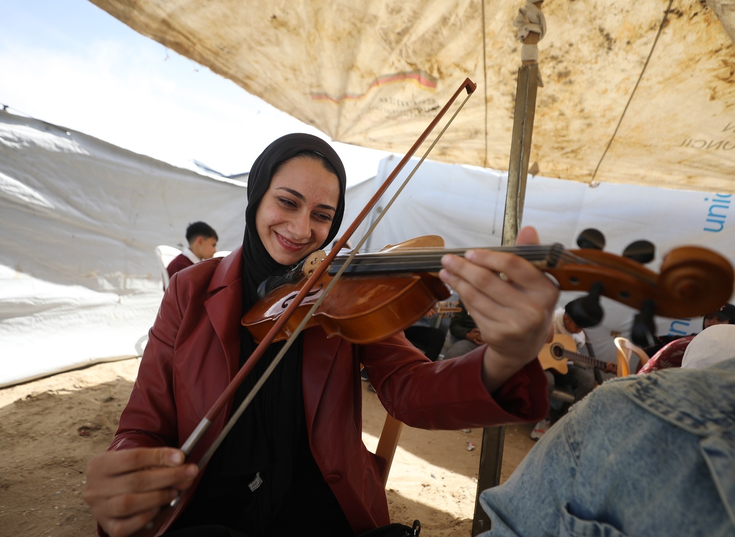 一名巴勒斯坦女孩正在临时教室学习拉小提琴,加沙市。这所使用难民营帐篷开设的临时教室由巴勒斯坦音乐教师 Ahmed Abu Umsha 发起,旨在通过音乐教育减轻战争对加沙儿童造成的心理创伤,目前开设的课程包括小提琴、吉他和乌德琴等乐器。国际救助儿童会报告指出,加沙地带约80%儿童在经历长期封锁后存在抑郁症倾向。摄影师:Hassan Jedi
