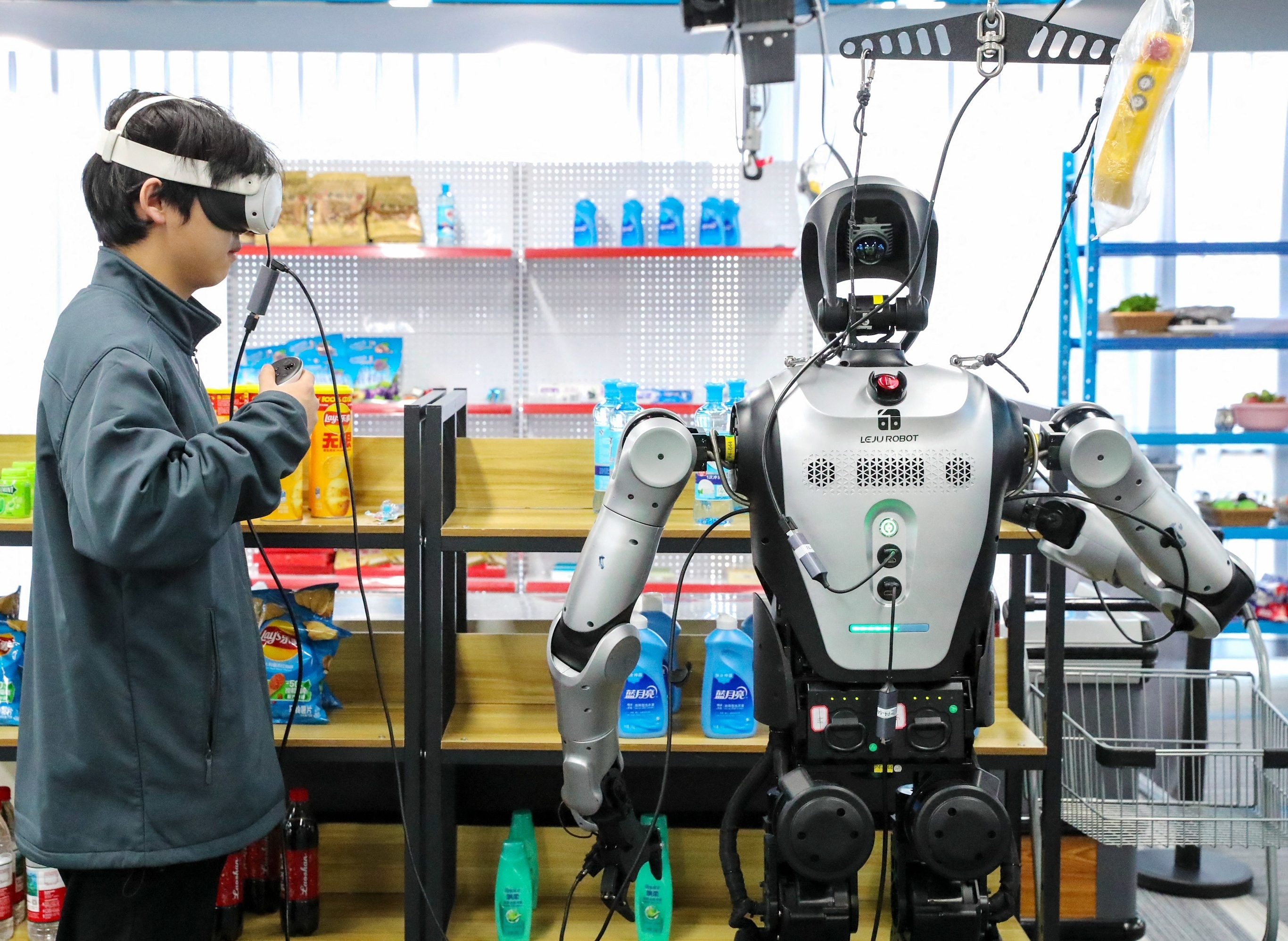山东青岛人形机器人数据采集训练场,一名工作人员通过手持感应手柄对机器人进行数据训练,中国。这座机器人训练场于2025年12月初启动试运营,占地面积约1500平方米,提供汽车制造、3C工厂、物流、商超等7种训练场景,主要由数据采集员通过VR头显、感应手柄等设备指导人形机器人学习抓取、搬运与分拣等精细化操作。市场调研公司 Omdia 报告显示2025年全球人形机器人出货量达1.33万台,同比增长4.8倍,其中87%来自中国制造商。摄影师:iDaily Media