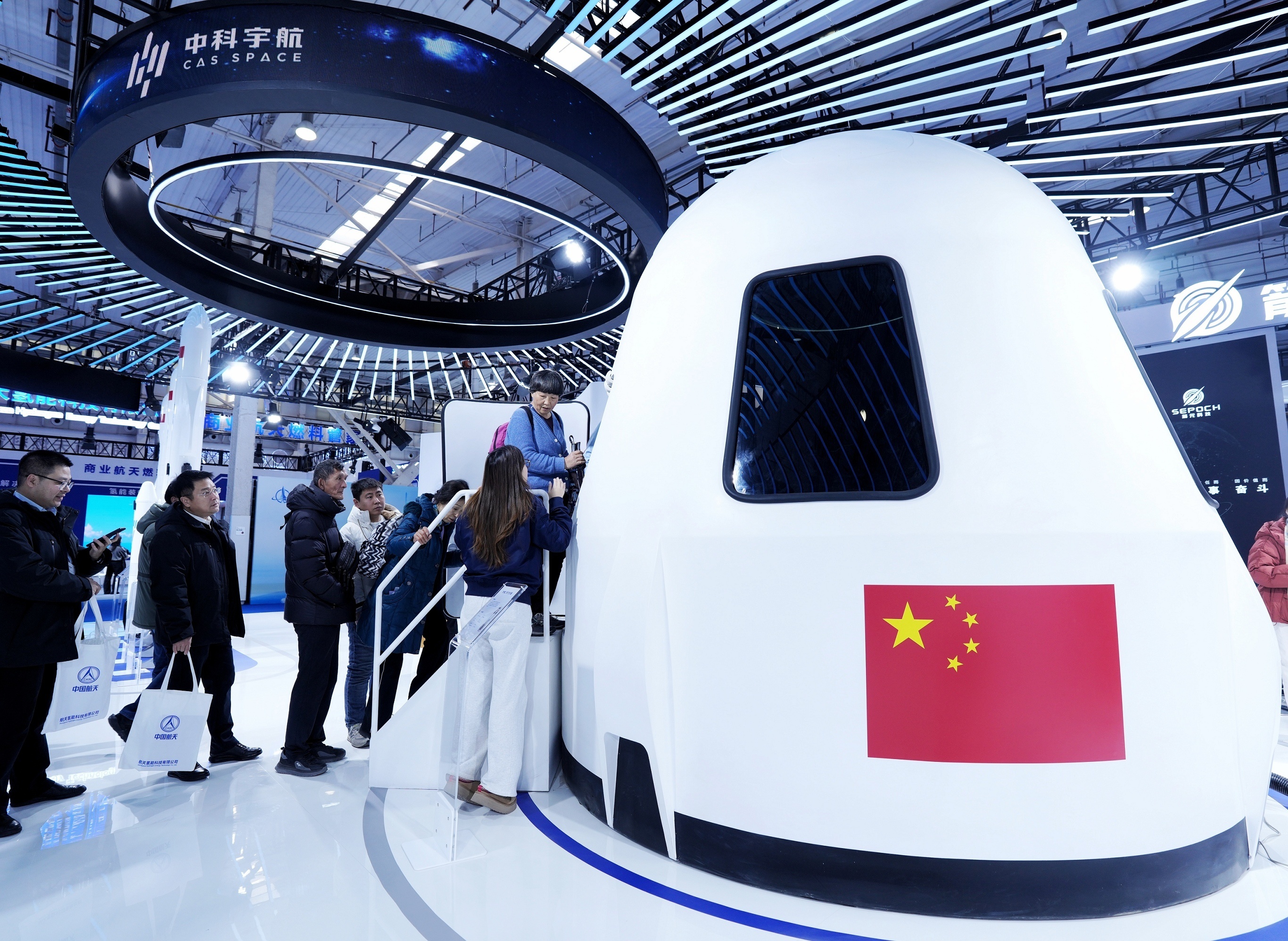 2026年北京国际商业航天展览会,观众排队参观「力鸿二号」飞行器模型。1月23日,第3届北京国际商业航天展在亦庄开幕,本届主题为「汇聚全球资源,共促商业航天」,展示面积约2万平方米,共有约300家企业参展,参展商品覆盖火箭与运载系统、卫星制造、航天测控、载荷应用、航天服务与配套等领域,预计吸引5万人次参观。《中国商业航天产业发展报告》显示2025年中国航天行业融资总额达186亿元,同比增长32%。摄影师:Zhang Xiangyi
