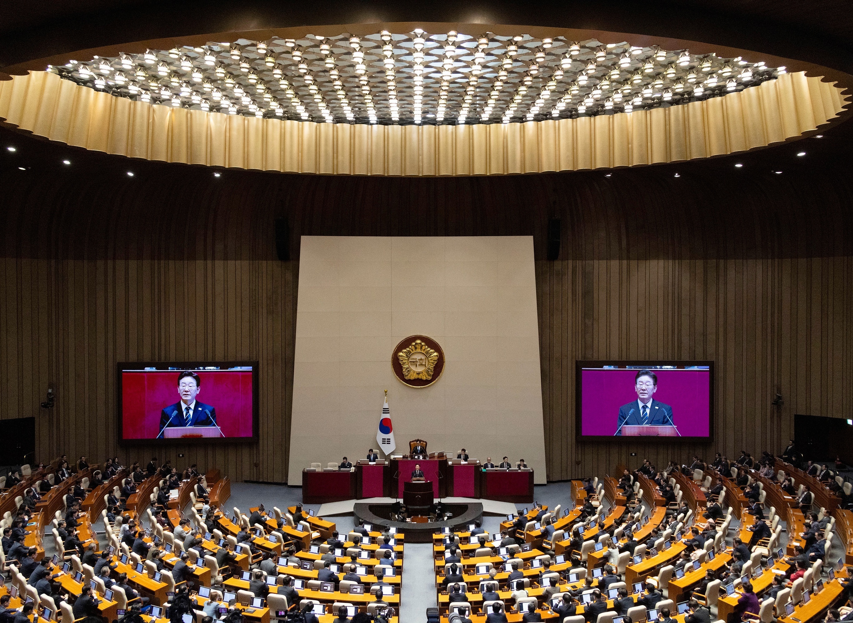 韩国总统李在明在国会针对补充预算案进行发言,首尔。4月2日,韩国总统李在明强调国家已进入「战时民生经济状态」,有必要调动一切可用资源应对中东局势导致的能源短缺危机,敦促国会尽快批准总额达26.2万亿韩元(约合172亿美元)的补充预算案。李在明指出本轮补充预算案无需额外发行国债,而是从股市和半导体行业的超额税收中拨款筹措。韩国贸易协会数据显示该国70%石油和20%液化天然气来自中东地区。摄影师:Jeon Heon-Kyun