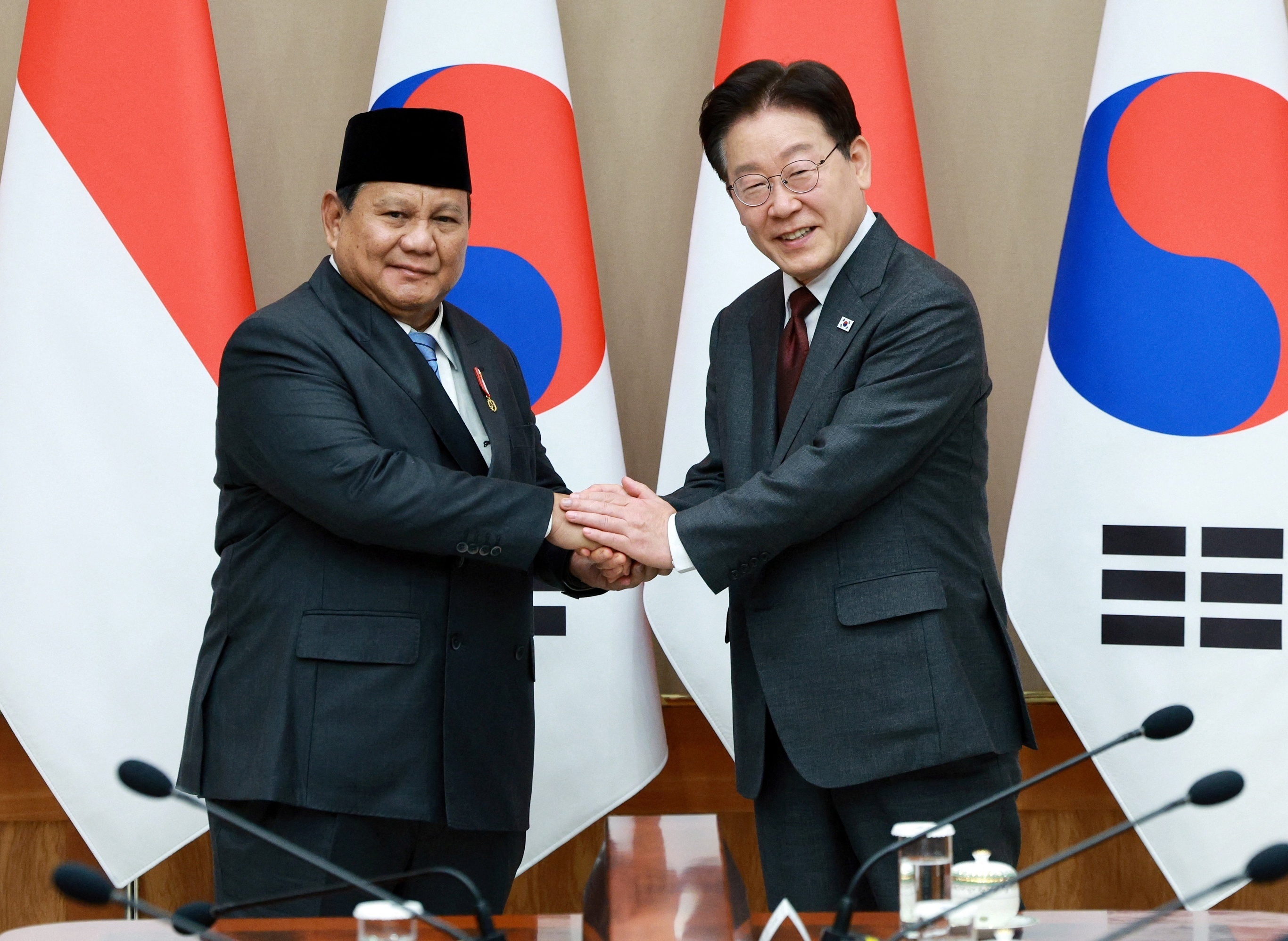 法国总统 Emmanuel Macron 与韩国总统李在明举行会晤,首尔青瓦台。4月2日,法国总统 Macron 对韩国进行为期2天国事访问,两国领导人就双边关系、国际和地区局势等议题举行约40分钟会谈,宣布将两国关系提升为「全球战略伙伴关系」,见证签署11份谅解备忘录及合作意向书。双方同意在关键矿产、核电、海上风电、人工智能、半导体等领域加强合作,探讨应对中东危机和保障霍尔木兹海峡航行安全的合作方案。韩国是法国在亚洲的第三大贸易伙伴,2025年韩法双边贸易额为150亿美元,创下历史新高,两国目标至2030年将贸易额提升至200亿美元。摄影师:Jung Yeon-Je