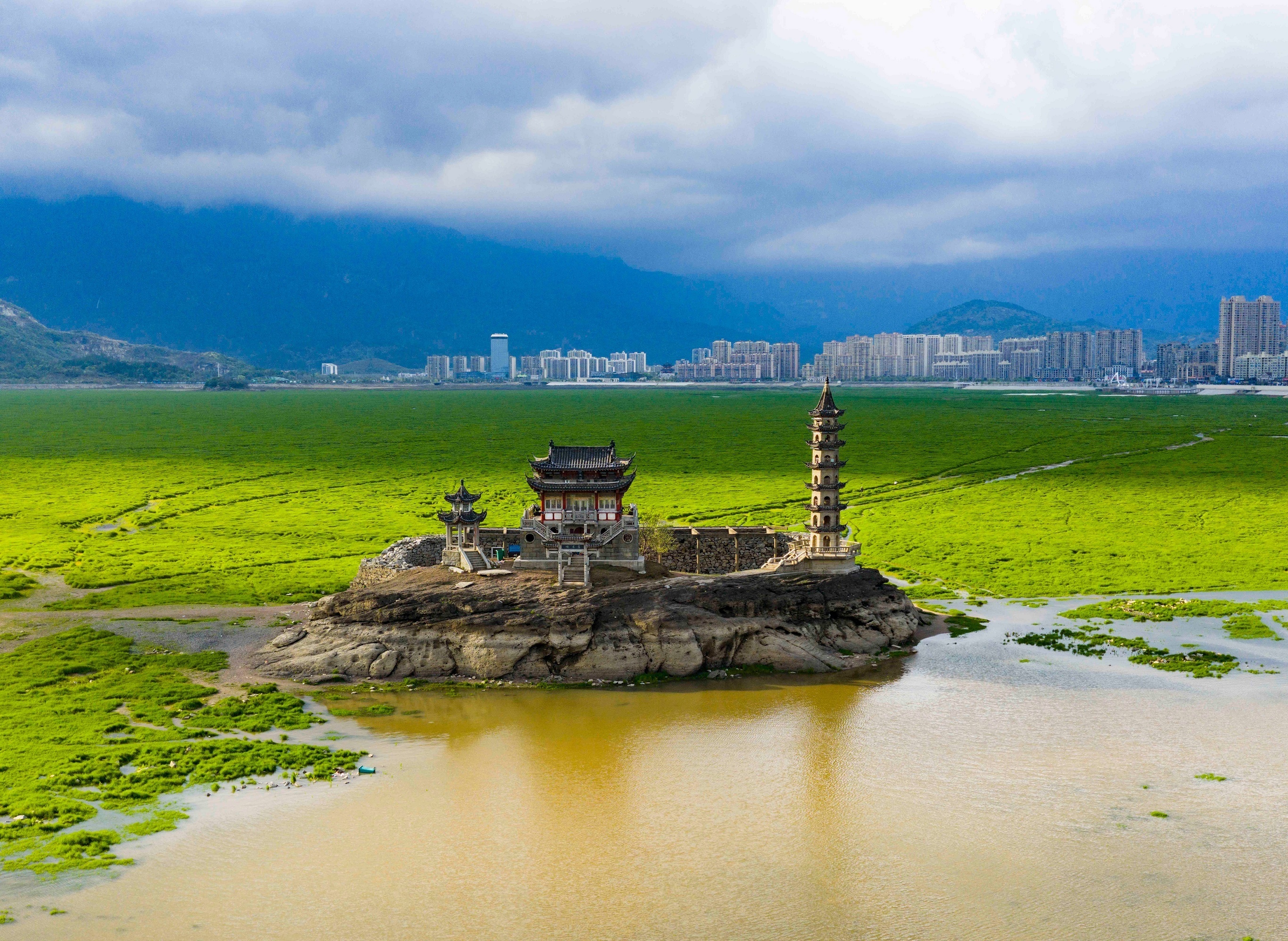 江西鄱阳湖水位上涨至湖心景点「落星墩」周边湿地,中国。3月31日,江西鄱阳湖水文站星子站水位涨至12米以上,本年度首次突破枯水线。受持续降雨影响,鄱阳湖水位呈现稳步回升的态势,目前湖区通江水体面积已达到1400平方公里,比去年同期扩大960平方公里,容积达29.4亿立方米,比去年同期提升17.8亿立方米。摄影师:iDaily Media