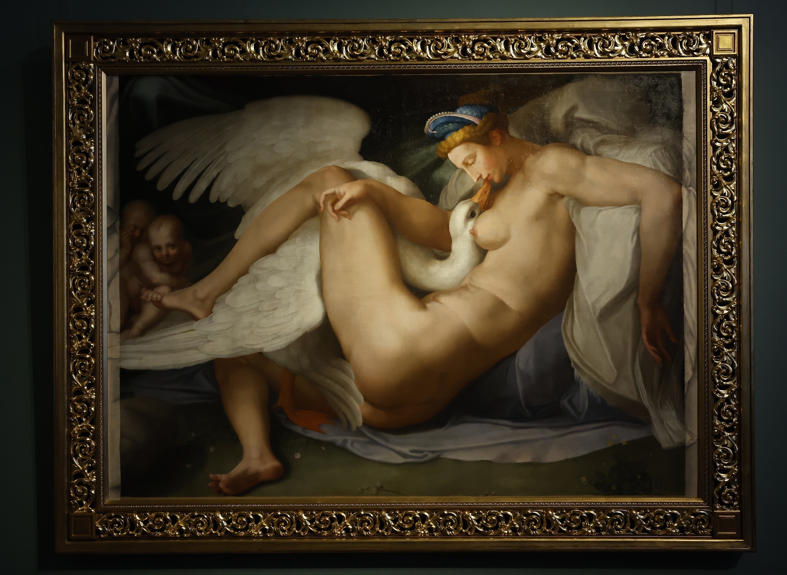 俄罗斯冬宫博物馆意大利展厅,一幅修复后的16世纪米开朗基罗画派的《丽达与天鹅》(Leda and the Swan)正在展出,圣彼得堡。这幅画临摹自米开朗基罗1530年创作、现已失传的同名画作,描绘了宙斯化身天鹅引诱斯巴达王后丽达的希腊神话故事,尺幅达到204x148厘米,为同题材绘画中最大的一件,亦是创作时间与原作最为接近的一幅。该画作目前由私人收藏,将在冬宫博物馆展出至4月底。摄影师:Anatoly Maltsev