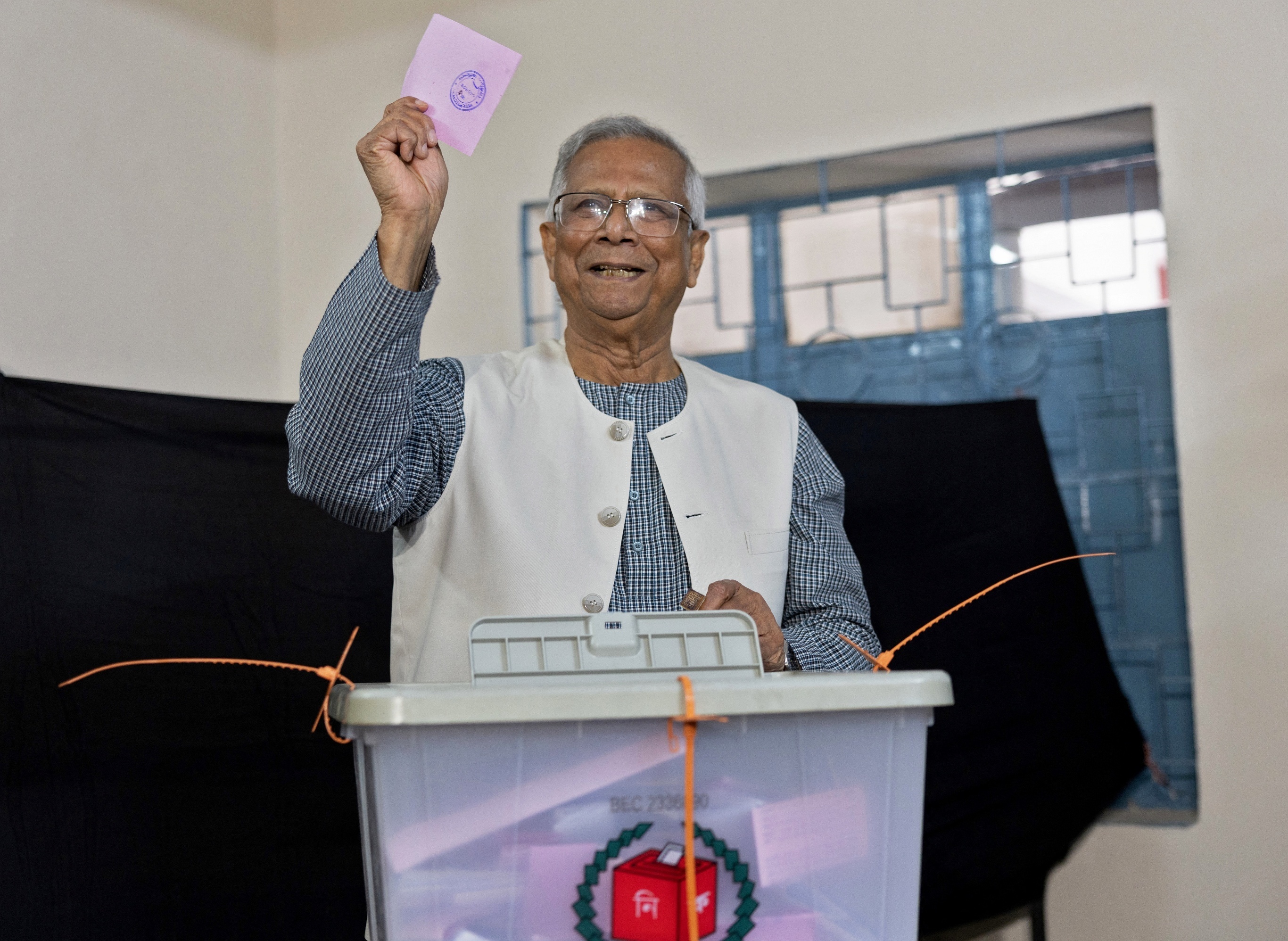 孟加拉国临时政府首席顾问 Muhammad Yunus 参加国民议会选举投票,达卡。2月12日,孟加拉国举行2024年学生骚乱后的首次大选,共有2028名候选人参与角逐299个国会席位,登记选民人数达到1.27亿人。初步计票结果显示,本次大选投票率为60.69%,孟加拉国民族主义党(BNP)与盟友赢得212席,伊斯兰大会党与盟友赢得70席。获得半数以上席位的政党或联盟可组建政府并提名总理,预计孟加拉国民族主义党主席 Tarique Rahman 将成为新任总理。摄影师:iDaily Media