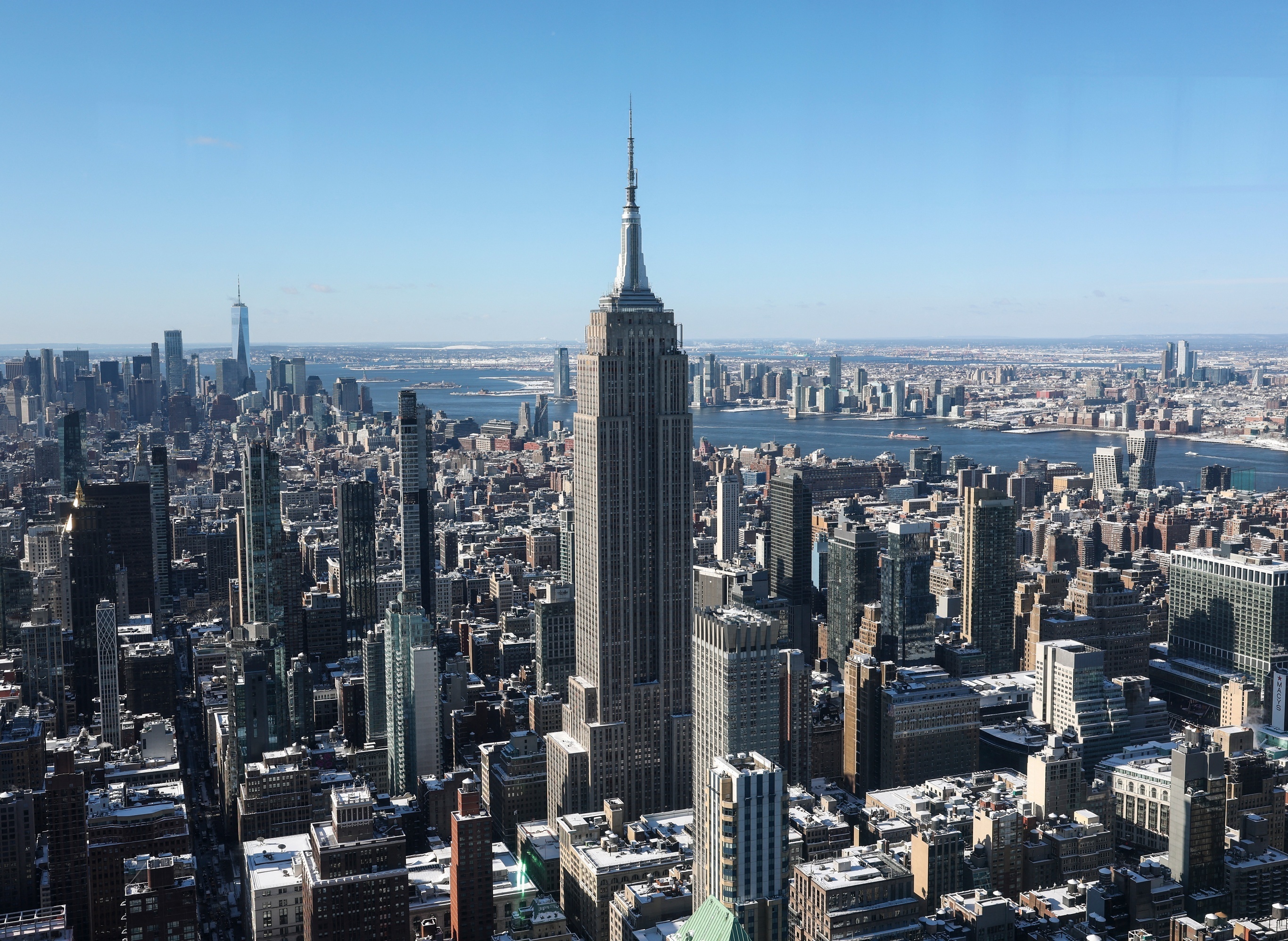 俯瞰纽约帝国大厦及中央建筑群。2月20日,美国商务部公布2025年第四季度 GDP 按年率增长1.4%,较上季度放缓3个百分点,大幅低于市场预期;2025年美国全年 GDP 增速为2.2%,较2024年放缓0.6个百分点,主要受私人消费增速下滑、劳动力市场疲软以及联邦政府停摆等负面因素影响。国际货币基金组织(IMF)预测2026年美国经济增长率将达到2.6%,失业率回落至4.1%。摄影师:Angela Weiss