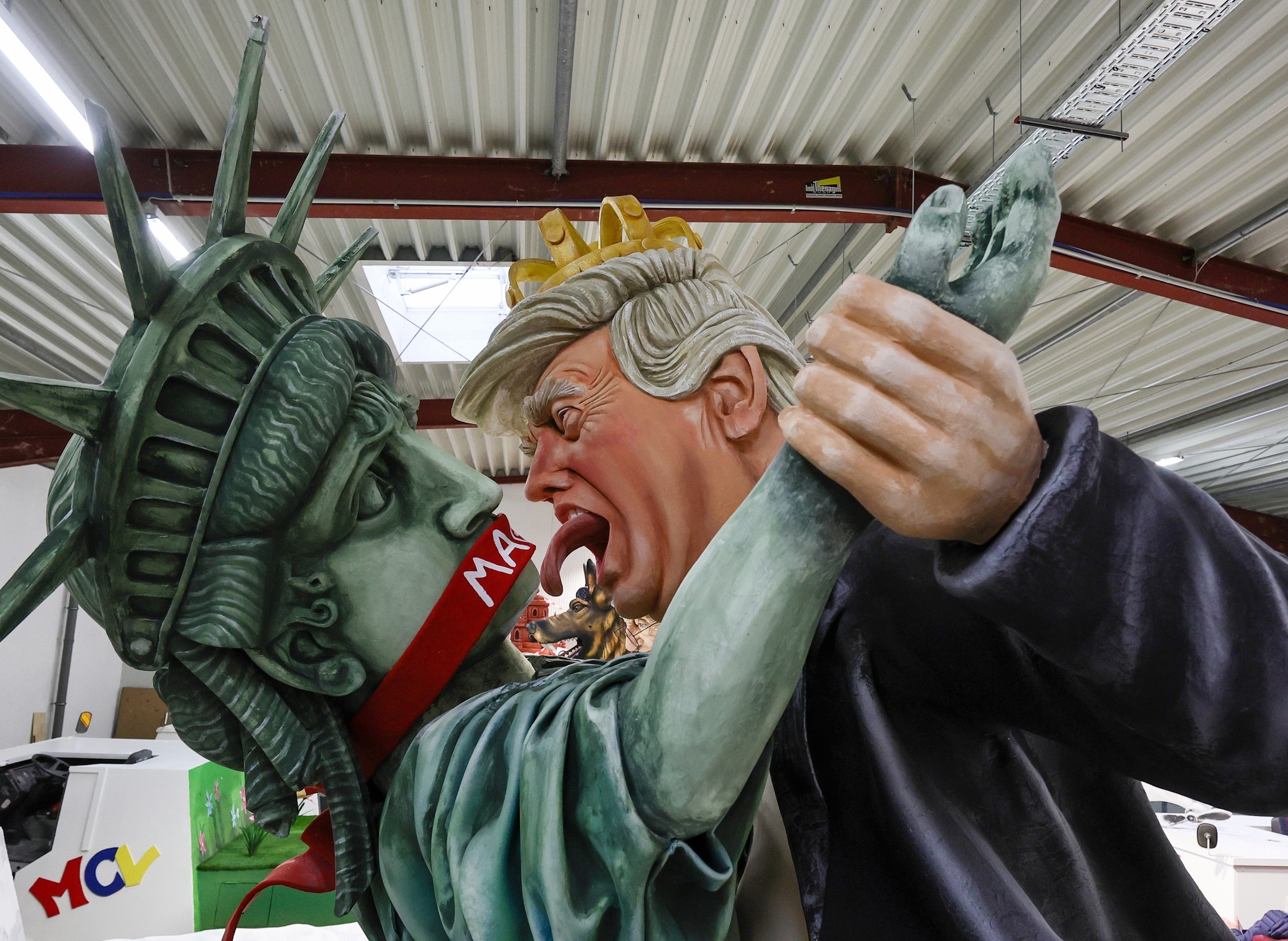 2026年德国美因茨狂欢节(Mainz Carnival)游行前夕,工坊正在制作一辆政治讽刺主题花车,自由女神像被一张写着「让美国再次伟大」(MAGA)的布条封住嘴部。本年度美因茨狂欢节的花车游行典礼将于2月16日举行,共有11辆花车和121支表演队伍参加,路线全长7公里,预计将吸引超过50万游客观看。德国联邦统计局本周公布数据显示2025年德国工业产出同比下降-1.1%,连续第4年下滑,主要受劳动力和能源成本高企以及外部需求疲软等影响。摄影师:Ronald Wittek