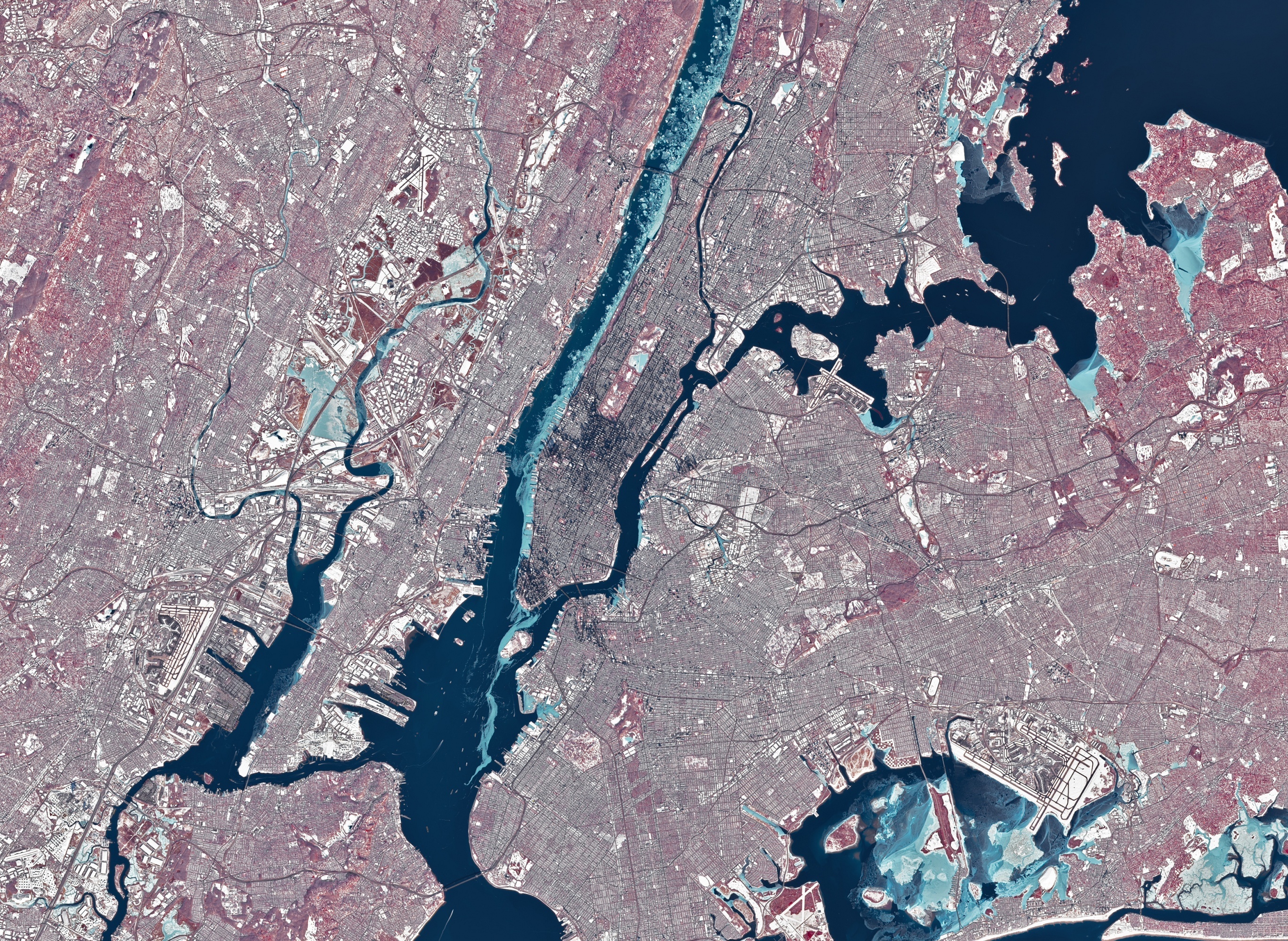 美国地质调查局公布一张俯瞰纽约曼哈顿的卫星图。2月7日,美国国家气象局向纽约市发布20年来首个「极端寒潮预警」,风寒效应导致市区体感温度最低降至-30℃,预计未来一周最低气温仍将维持在0℃以下。纽约警方通报称2026年迄今该市已有17人在户外死亡,其中13人死因与低温症有关。纽约市政府已在全市设置60个避寒中心安置无家可归者。纽约是美国无家可归者最多的城市,约有超过15万人无固定住所。摄影师:Landsat