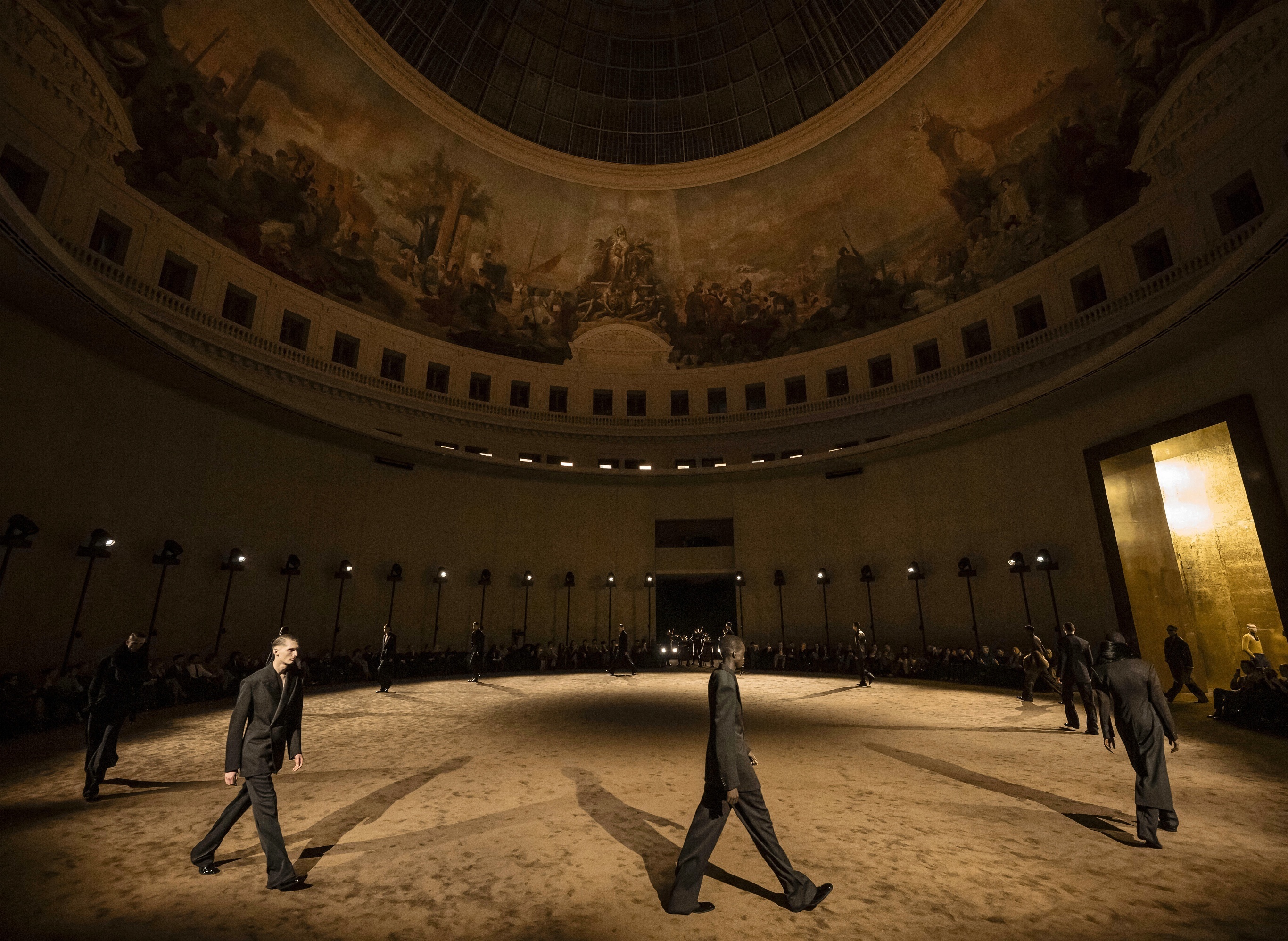 巴黎 2026 秋冬男装周 Saint Laurent 秀场,模特正在展示品牌创意总监 Anthony Vaccarello 新一季男装作品,皮诺艺术收藏馆。本季男装作品以 James Baldwin 1956年出版的同志题材小说《乔瓦尼的房间》为灵感启发,设计师在品牌标志性吸烟装和修长大衣廓形中融入具有力量感的宽肩剪裁,搭配柔软的褶皱肌理和印花丝绸领巾、皮草披肩、高筒靴等单品,塑造脆弱和力量并存的男性形象。摄影师:Eliot Blondet