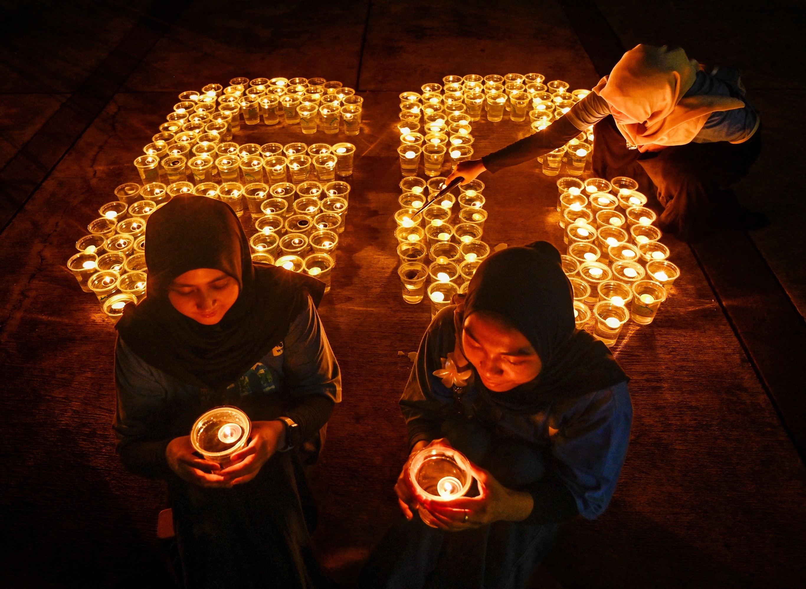 印度尼西亚环保人士举行「地球一小时」(Earth Hour)庆祝活动,班达亚齐。3月28日,巴黎埃菲尔铁塔、巴塞罗那圣家堂、悉尼歌剧院、纽约帝国大厦、柏林勃兰登堡门等全球多个知名地标建筑在晚上20点30分关闭照明响应「地球一小时」环保倡议活动。「地球一小时」由世界自然基金会于2007年发起,旨在鼓励人们关闭不必要的照明设施,表达对气候变化行动的支持,迄今参与规模达到全球190个国家和地区,成为世界规模最大的环保倡议活动。摄影师:Chaideer Mahyuddin
