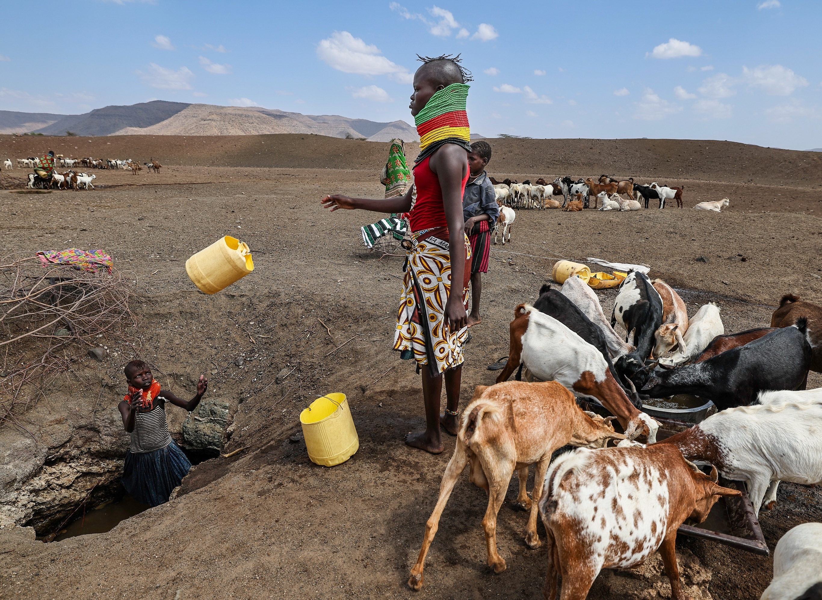肯尼亚儿童在干涸的水塘中挖坑取水,图尔卡纳。2月10日,联合国人道主义事务协调厅发布报告警告东非地区正在面临有史以来最严重的干旱危机,索马里、埃塞俄比亚、肯尼亚等多个国家遭受影响,部分地区土壤湿度已降至历史最低水平。肯尼亚国家干旱管理局(NDMA)通报全国47个郡中的10个郡处于干旱状态,超过200万人面临饥荒、疾病和营养不良的风险。摄影师:Daniel Irungu