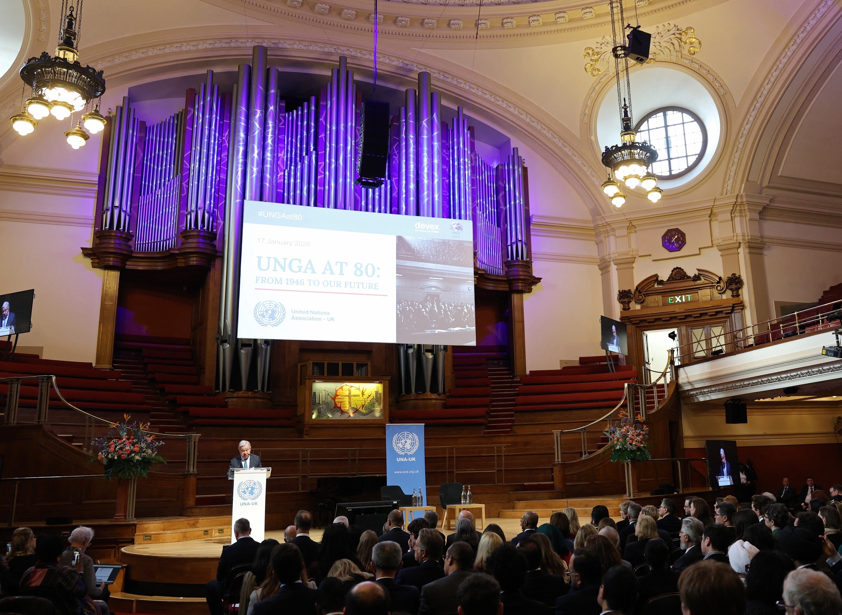 联合国秘书长 Antonio Guterres 在伦敦卫理公会中央礼堂发表纪念联合国大会第一届会议召开80周年的演讲,英国。1月17日,伦敦卫理公会中央礼堂举办联大第一届会议召开80周年纪念活动,共有来自全球的超过1000名代表出席。联合国秘书长 Guterres 在演讲中警告称,强大的势力正在联合起来破坏全球合作,数据算法正在传播虚假信息、助长仇恨并为独裁者提供强大控制工具,随着全球权力中心的转移,国际社会面临着构建更公平还是更动荡未来的抉择。受到成员国拖欠会费影响,联合国2026年常规运营预算被迫削减-7%至34.5亿美元,该机构还将在本年度裁撤2900个岗位以降低运营成本。美国为联合国会费的最大欠费国。摄影师:Toby Shepheard
