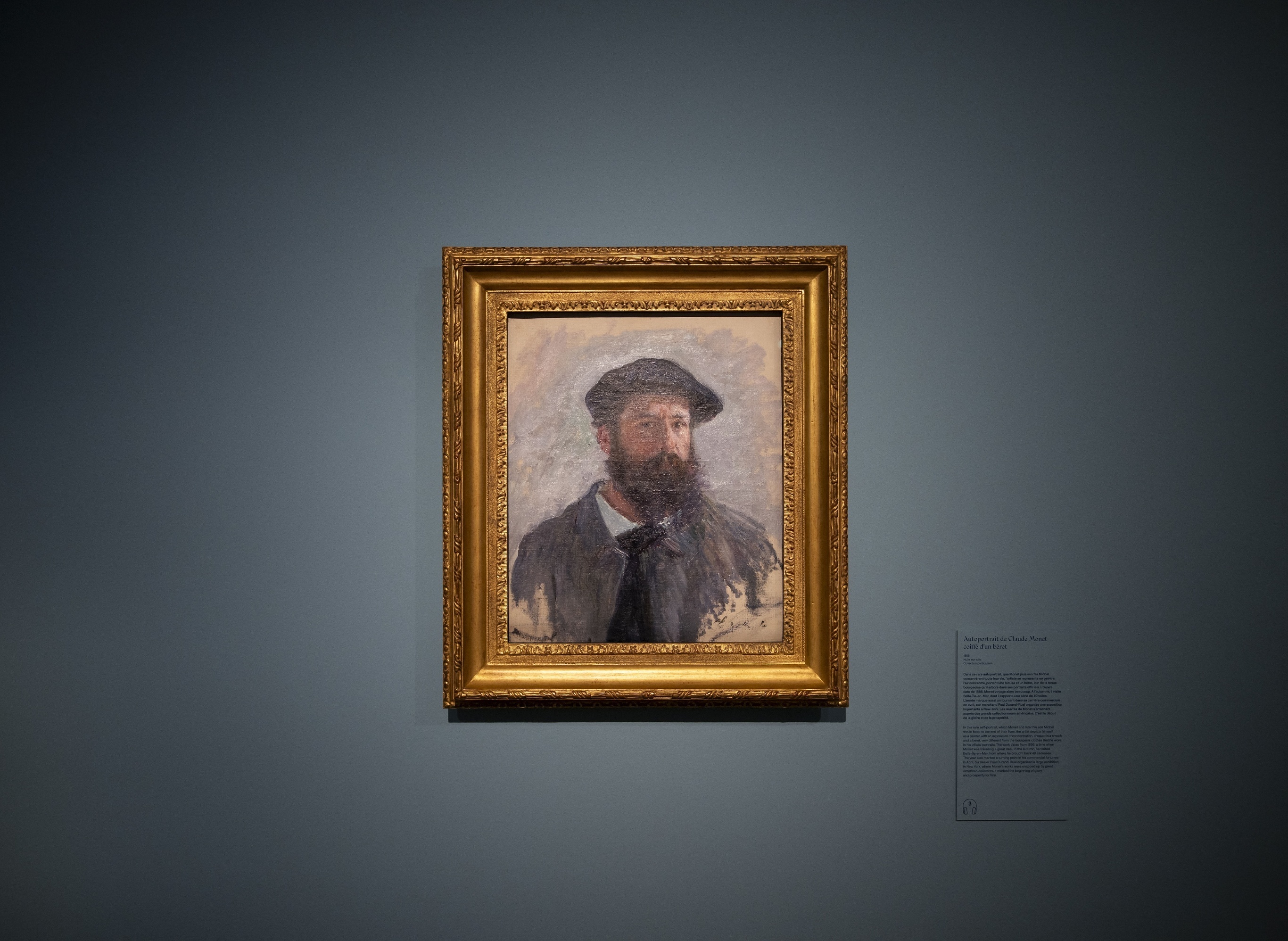 法国吉维尼印象派博物馆举办「睡莲之前:莫奈眼中的吉维尼」特展,一幅法国印象派画家 Claude Monet 1886年油画《戴贝雷帽的自画像》正在展出,诺曼底大区。本次展览旨在纪念莫奈逝世100周年,聚焦1883年至1890年莫奈在吉维尼乡间的早年生活,共展出莫奈在吉维尼创作的约30幅画作,涵盖罂粟花、白杨树、草地、山丘、塞纳河畔等题材。展期持续至7月5日。摄影师:Eliot Blondet